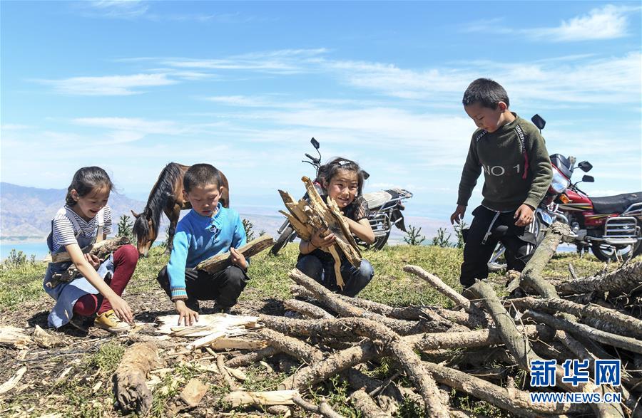 在新疆特克斯縣境內的夏牧場里,小朋友在幫家人拾柴(7月2日攝)。新華社記者王菲攝
