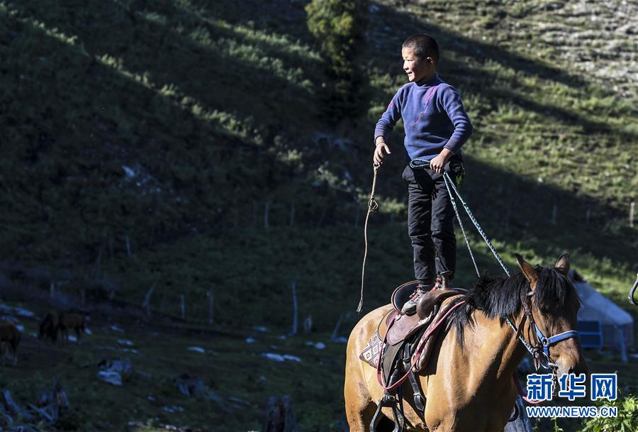 在新疆特克斯縣境內(nèi)的夏牧場里,一名小朋友站在馬背上玩耍(6月30日攝)。新華社記者王菲攝