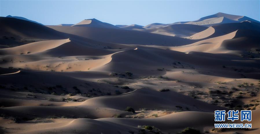 這是7月8日拍攝的騰格里沙漠風(fēng)光。位于內(nèi)蒙古自治區(qū)阿拉善左旗西南部和甘肅省中部邊境的騰格里沙漠是我國(guó)第四大沙漠,總面積約為4.3萬(wàn)平方公里。夏日傍晚,騰格里沙漠連綿的沙丘被日光勾勒出美麗的線條,美不勝收。新華社記者連振攝