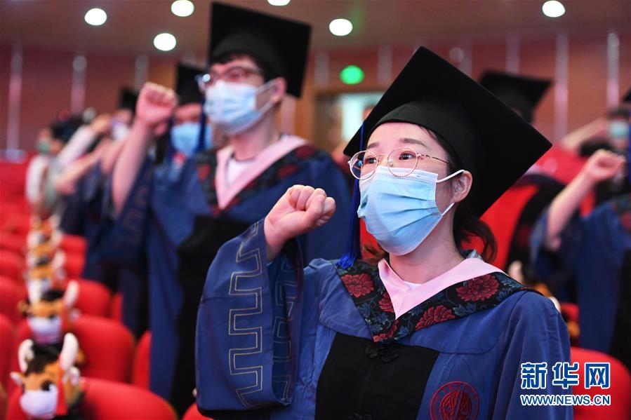 7月10日,中國政法大學(xué)2020屆畢業(yè)生在畢業(yè)典禮上重溫入學(xué)誓詞。當(dāng)日,中國政法大學(xué)舉行2020屆畢業(yè)典禮。由于疫情防控需要,僅少量在校畢業(yè)生在中國政法大學(xué)昌平校區(qū)禮堂現(xiàn)場參加畢業(yè)典禮,更多畢業(yè)生通過線上直播參與。新華社記者任超攝