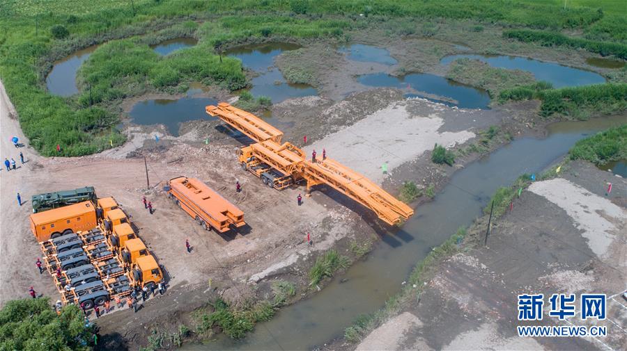 7月10日,工作人員在演練現(xiàn)場搭建機(jī)械化橋梁(無人機(jī)照片)。當(dāng)日,由吉林省交通運輸廳主辦的公路橋梁水毀搶通應(yīng)急演練在長春市雙陽區(qū)雙陽河舉行,參與演練人員從汛情水毀信息報送、應(yīng)急裝備快速集結(jié)、機(jī)械化橋梁搶通搭設(shè)、善后處理等方面進(jìn)行實戰(zhàn)演練。新華社記者張楠攝