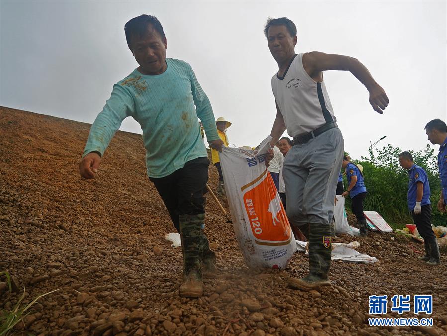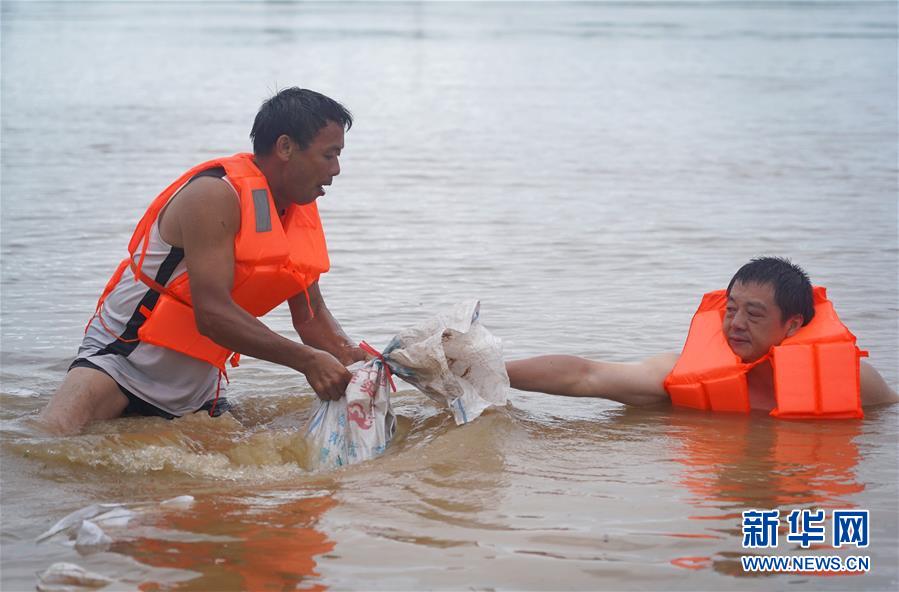 7月9日,邵忠如(前右)和村民們運送沙袋,封堵圩堤上的泡泉。新華社記者萬象攝