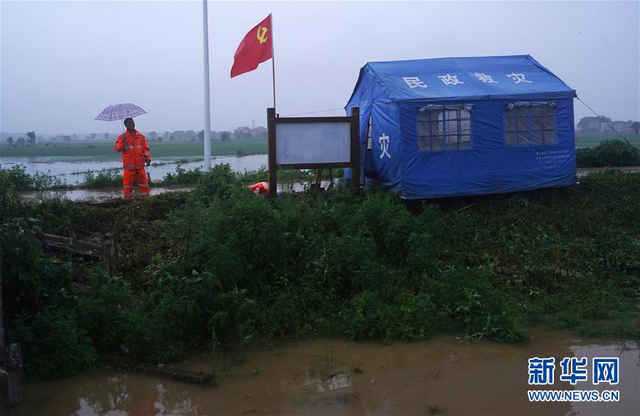 7月9日,邵忠如在圩堤上的救災棚旁觀察水情。新華社記者萬象攝