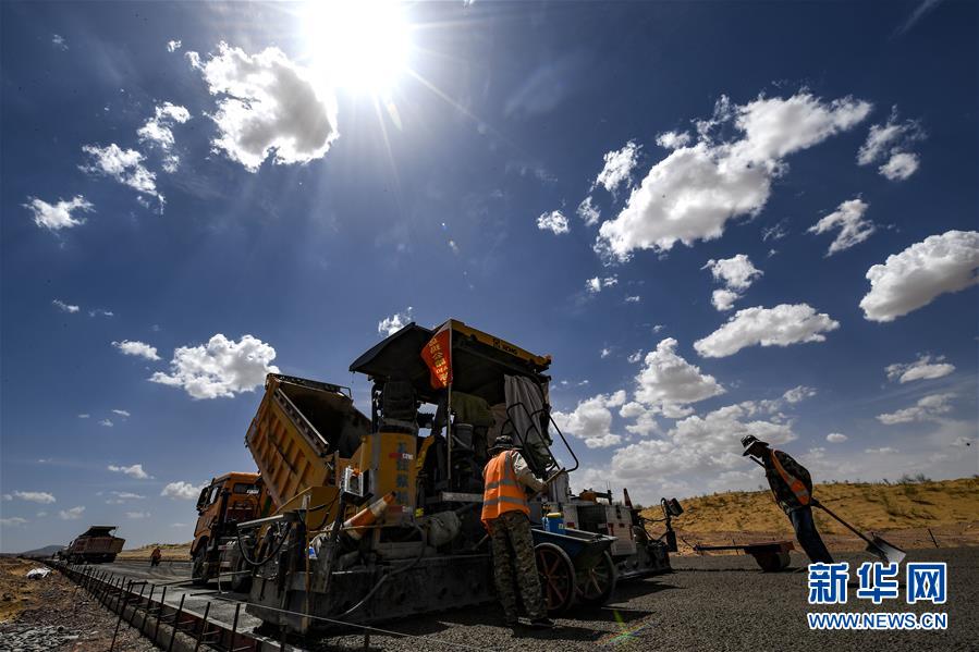 7月10日,工人在位于寧夏境內(nèi)的烏瑪高速青銅峽至中衛(wèi)段A10標(biāo)段施工。盛夏時(shí)節(jié),位于寧夏境內(nèi)的烏瑪(內(nèi)蒙古烏海市至青?,斍呖h)高速青銅峽至中衛(wèi)段正在抓緊施工建設(shè)。該路段主線全長122.9公里,其中穿越騰格里沙漠腹地的18公里公路是寧夏建設(shè)的首條沙漠高速公路,預(yù)計(jì)2021年建成通車。新華社記者馮開華攝。