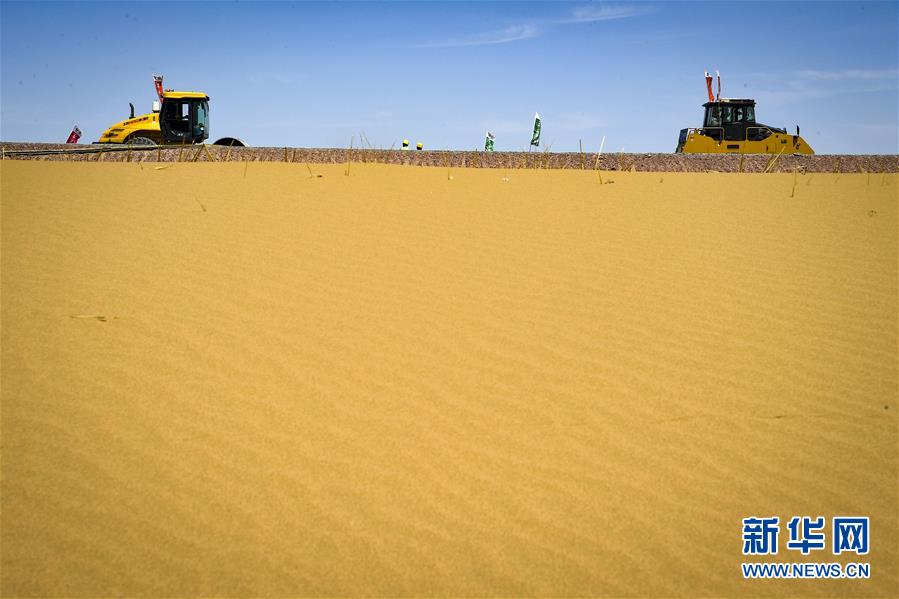 7月10日,工人在位于寧夏境內(nèi)的烏瑪高速青銅峽至中衛(wèi)段A10標(biāo)段施工。盛夏時(shí)節(jié),位于寧夏境內(nèi)的烏瑪(內(nèi)蒙古烏海市至青?,斍呖h)高速青銅峽至中衛(wèi)段正在抓緊施工建設(shè)。該路段主線(xiàn)全長(zhǎng)122.9公里,其中穿越騰格里沙漠腹地的18公里公路是寧夏建設(shè)的首條沙漠高速公路,預(yù)計(jì)2021年建成通車(chē)。新華社記者馮開(kāi)華攝。