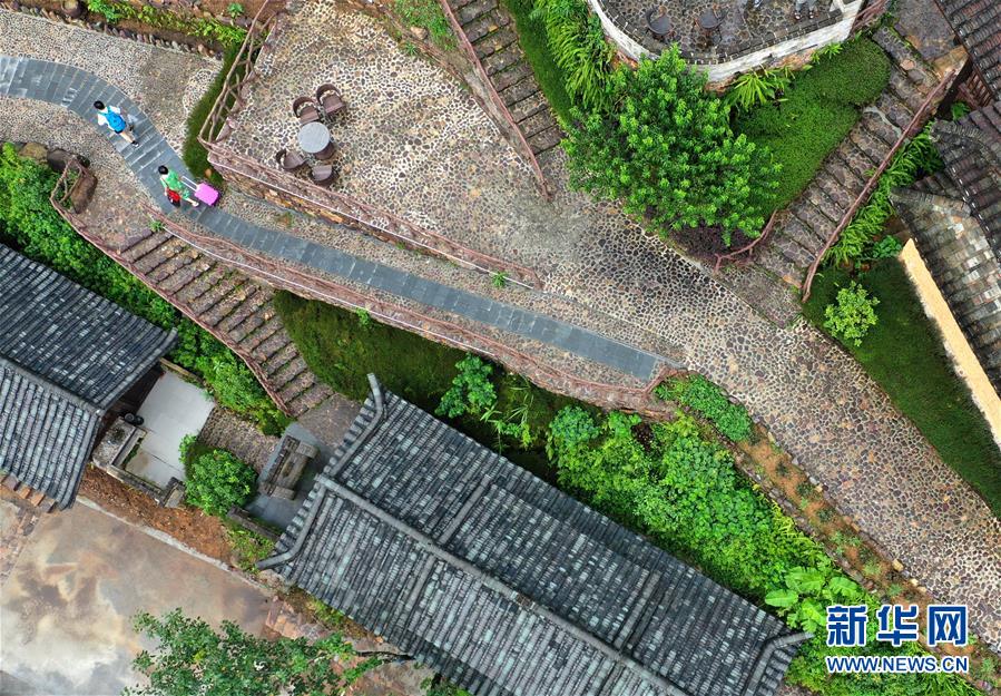7月11日,游客行走在金秀瑤族自治縣六巷鄉(xiāng)一處民宿內(nèi)(無人機(jī)照片)。近年來,廣西金秀瑤族自治縣依托當(dāng)?shù)刈匀簧鷳B(tài)優(yōu)勢,圍繞境內(nèi)豐富的瑤族文化,大力發(fā)展鄉(xiāng)村旅游,精心打造一批獨具瑤族特色的山間民宿酒店,取得良好經(jīng)濟(jì)效益。新華社記者 周華 攝