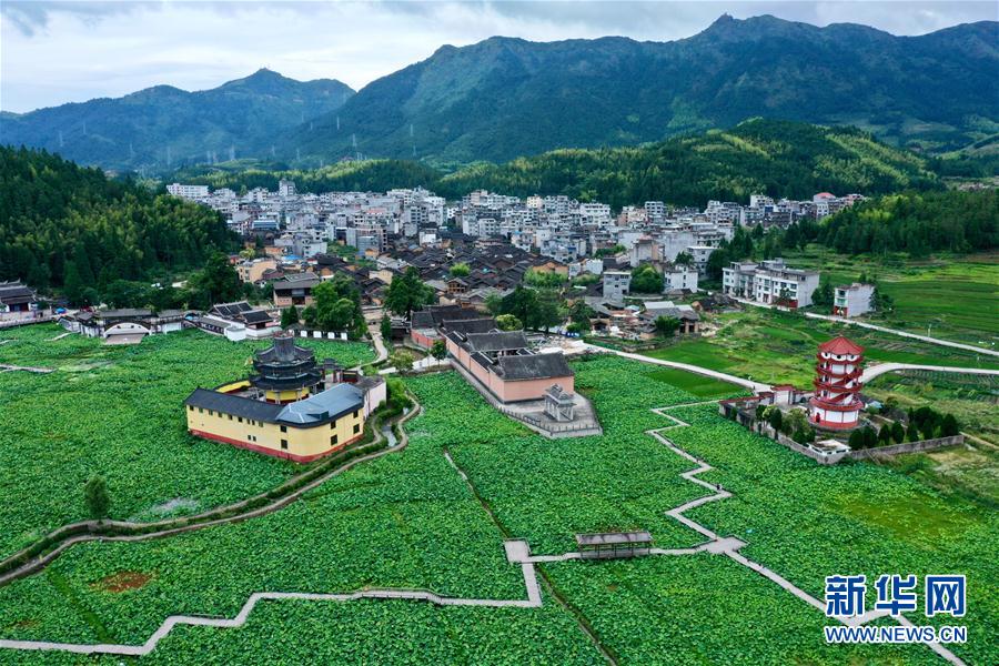 7月3日,浦源村鯉魚溪公園內荷花盛開,吸引游人前來觀賞(無人機照片)。新華社記者 姜克紅 攝