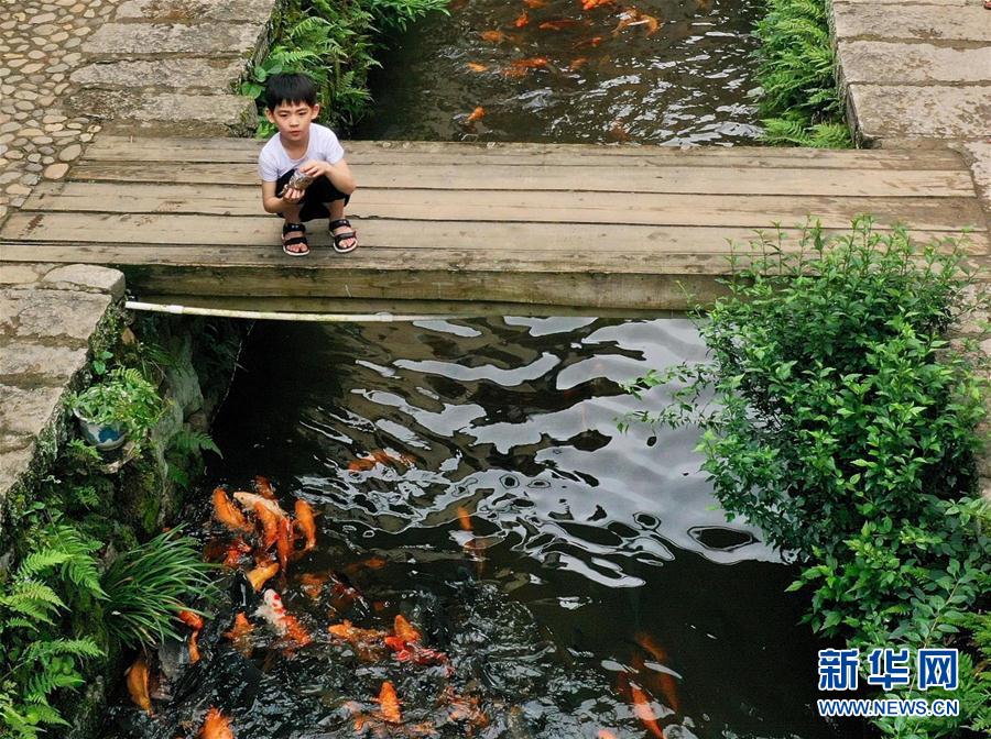 7月3日,一名男孩在浦源村鯉魚(yú)溪畔喂食溪中的鯉魚(yú)。新華社記者 姜克紅 攝