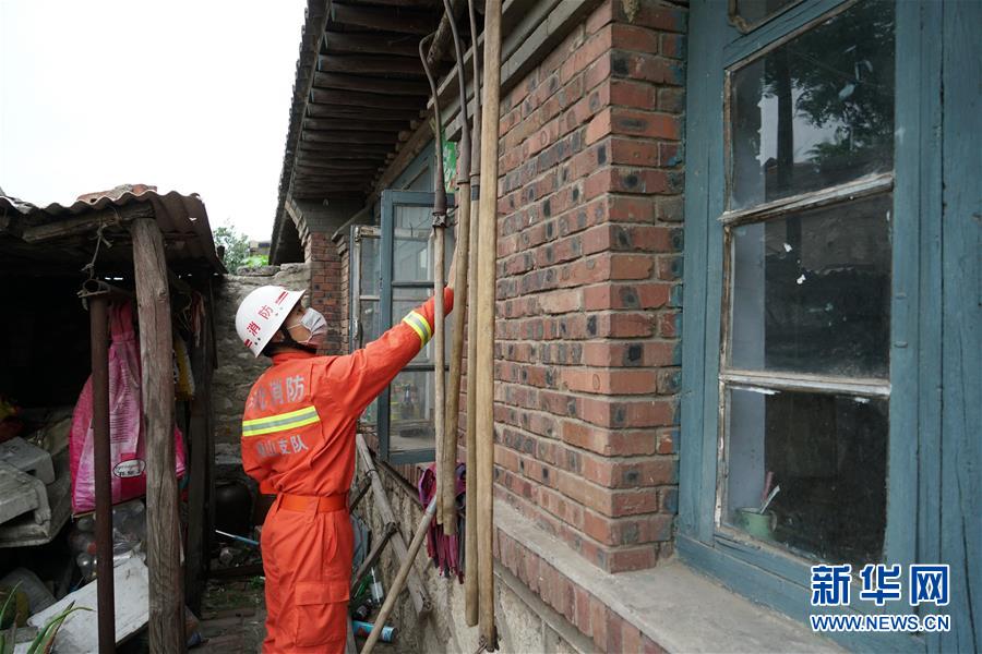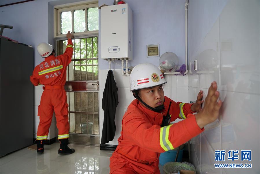 7月12日,消防救援人員在河北省唐山市古冶區(qū)卑家店鎮(zhèn)前巍峰山村村民家中排查。新華社記者 牟宇 攝