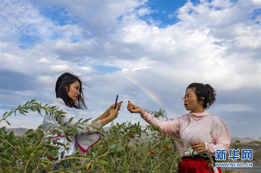 在新疆精河縣城近郊的一處枸杞園,朱虹美(右)和助手李紅英在拍攝視頻,向網友介紹待采收的枸杞(7月11日攝)。新華社記者 胡虎虎 攝