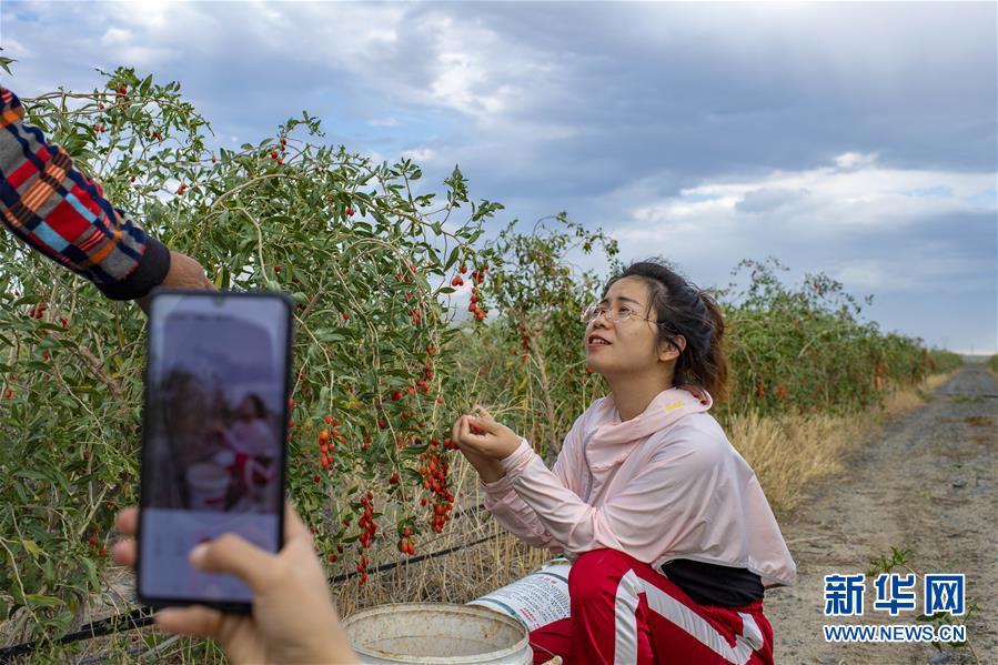 在新疆精河縣城近郊的一處枸杞園,朱虹美在拍攝枸杞采收視頻(7月11日攝)。新華社記者 胡虎虎 攝