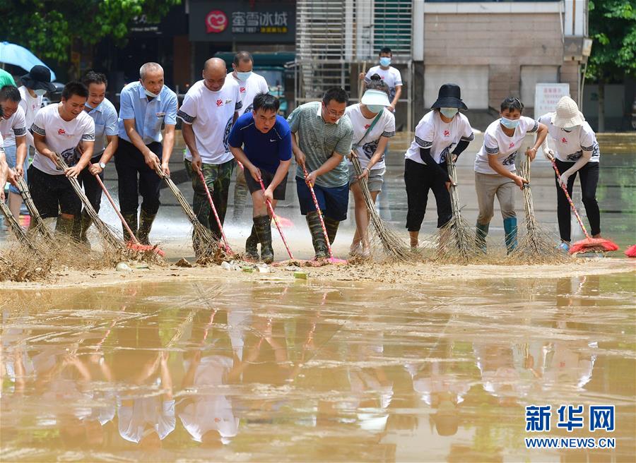 7月12日,融水苗族自治縣文化體育廣電和旅游局清淤小分隊在蘆笙廣場清理地面。當(dāng)日,在廣西柳州市融水苗族自治縣,融江洪水退去,當(dāng)?shù)叵嚓P(guān)部門組織多支清淤排險小分隊,積極開展災(zāi)后恢復(fù)工作。新華社記者 黃孝邦 攝