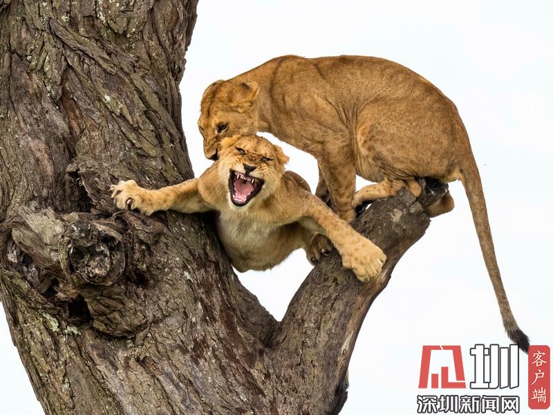 攝影師抓拍獅子上樹畫面 為爭奪位置憤怒咆哮互相攻擊