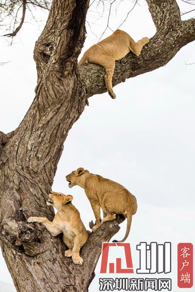 攝影師抓拍獅子上樹(shù)畫面 為爭(zhēng)奪位置憤怒咆哮互相攻擊