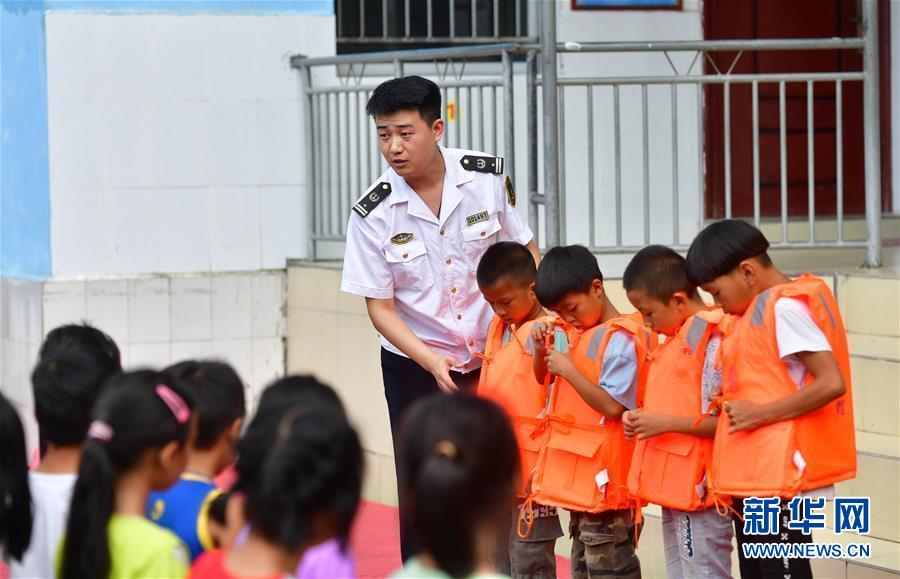 7月13日,在廣西融水苗族自治縣桿洞鄉(xiāng)黨鳩小學(xué),融水海事處工作人員指導(dǎo)學(xué)生穿救生衣。當(dāng)日,廣西柳州融水海事處在桿洞鄉(xiāng)黨鳩小學(xué)開展防溺水及水上交通安全知識教育活動(dòng),向?qū)W生們普及水上安全知識,并講解水上應(yīng)急救援技能。新華社記者 黃孝邦 攝