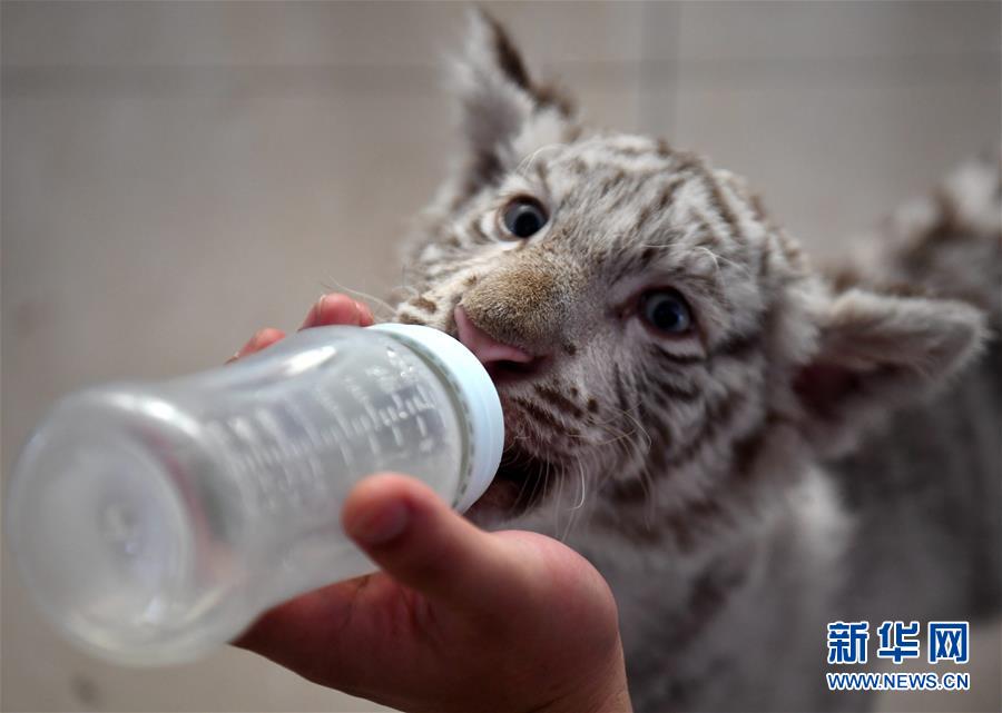 7月13日,工作人員給“妞妞”喂水。河北石家莊市動(dòng)物園的孟加拉白虎寶寶“妞妞”只有3個(gè)月大,由于虎媽媽經(jīng)驗(yàn)不足,“妞妞”一出生便由動(dòng)物園工作人員按科學(xué)方法人工飼養(yǎng)。目前,在飼養(yǎng)員的精心照料下,“妞妞”正在茁壯成長(zhǎng)。新華社記者 王曉 攝