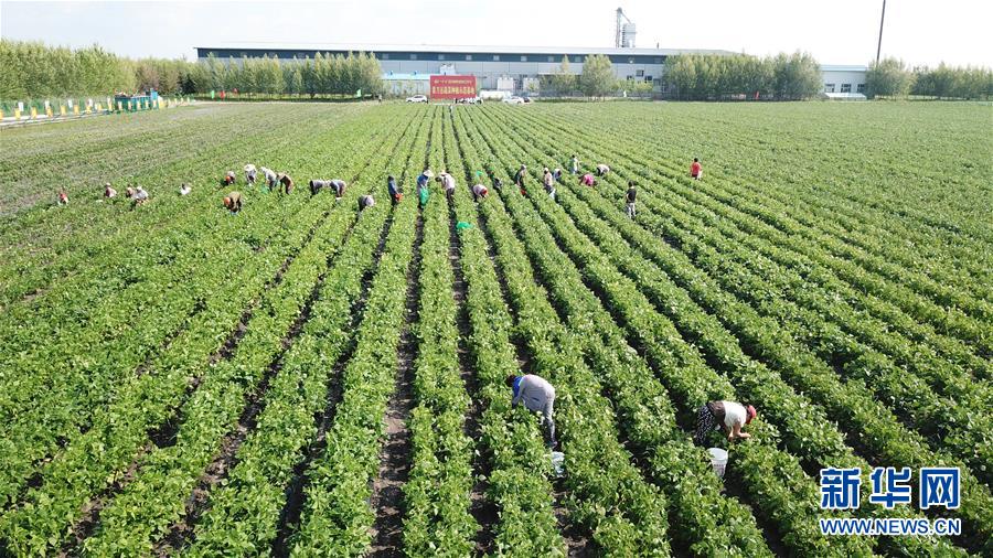 7月14日,在克東縣昌盛鄉(xiāng)青刀豆蔬菜種植示范基地,雇工在采摘青刀豆(無(wú)人機(jī)照片)。黑龍江省克東縣地處大興安嶺南麓,近年來(lái),當(dāng)?shù)卮罅Πl(fā)展扶貧產(chǎn)業(yè),探索“小院經(jīng)濟(jì)”、訂單種植和加工產(chǎn)業(yè)相融合新方式,帶動(dòng)農(nóng)民就業(yè)和脫貧增收。新華社記者 王建威 攝