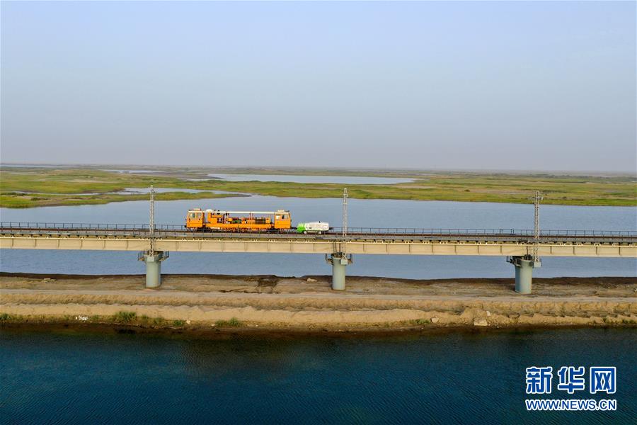鋼軌打磨車在臺(tái)特瑪湖特大橋上作業(yè)(7月14日攝,無人機(jī)照片)。新華社記者 丁磊 攝
