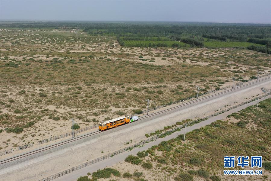 一列鋼軌打磨車(chē)行駛在工作區(qū)(7月14日攝,無(wú)人機(jī)照片)。新華社記者 丁磊 攝