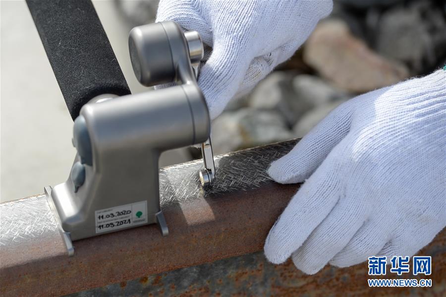 技術(shù)員用儀器進(jìn)行鋼軌廓形檢測(7月14日攝)。新華社記者 丁磊 攝