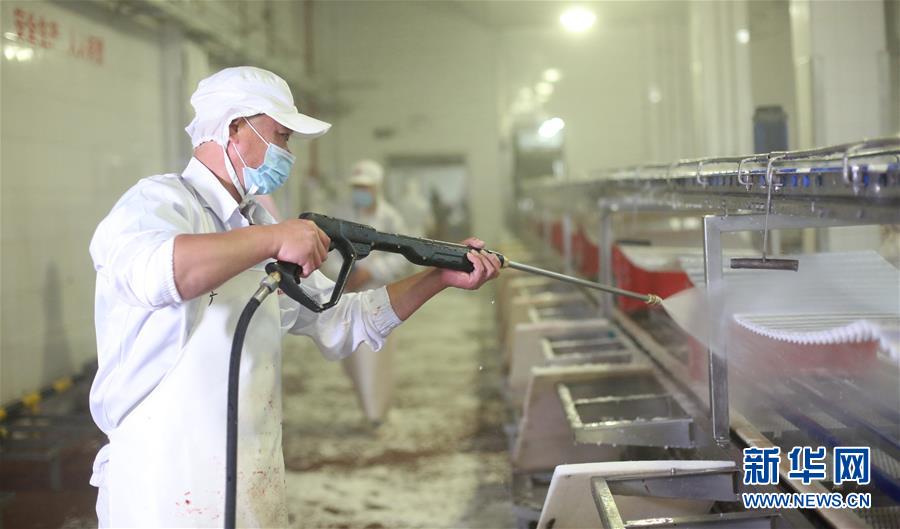 7月14日,北京二商肉類食品集團(tuán)有限公司員工對(duì)肉類分割流水線進(jìn)行清洗消毒。北京二商肉類食品集團(tuán)有限公司是保障北京肉類市場(chǎng)供應(yīng)的主要企業(yè)之一。新冠肺炎疫情以來(lái),企業(yè)嚴(yán)格實(shí)施北京市、農(nóng)業(yè)農(nóng)村部和中國(guó)肉類協(xié)會(huì)的防疫要求,對(duì)進(jìn)入廠區(qū)的人員、車輛以及原料采購(gòu)、屠宰分割、產(chǎn)品加工、貯藏運(yùn)輸、廢棄物收集及污水處理等生產(chǎn)環(huán)節(jié)嚴(yán)格防疫,強(qiáng)調(diào)源頭把關(guān)徹底消毒。目前,集團(tuán)公司下屬多家生豬屠宰加工基地正常運(yùn)營(yíng),保質(zhì)保量供應(yīng)北京市場(chǎng)需求。新華社記者 李欣 攝