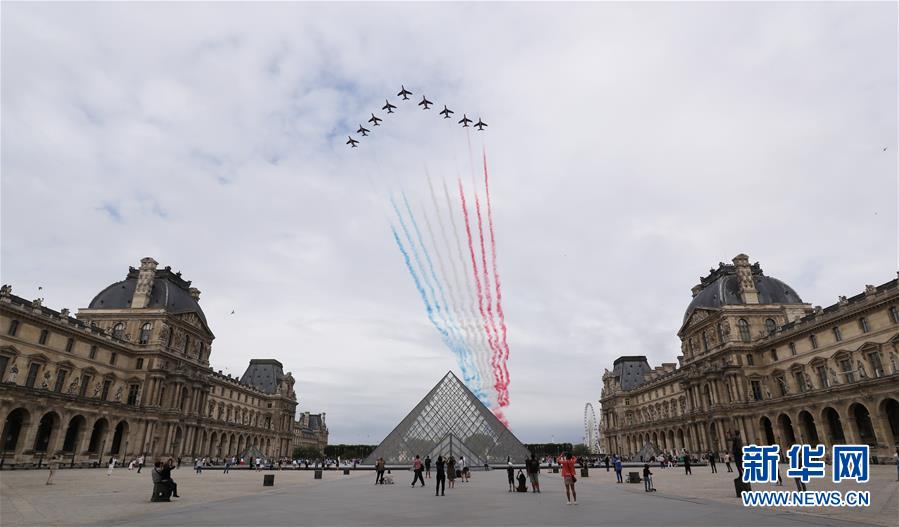 7月14日,“法蘭西巡邏兵”飛行表演隊(duì)飛過法國巴黎盧浮宮玻璃金字塔廣場(chǎng)。法國一年一度的國慶閱兵式14日在巴黎舉行。受疫情影響,法國總統(tǒng)馬克龍沒有在香榭麗舍大街舉行國慶閱兵式,而是在協(xié)和廣場(chǎng)舉行小型慶祝儀式,向在抗疫斗爭(zhēng)中做出貢獻(xiàn)的公民致敬。新華社記者高靜攝