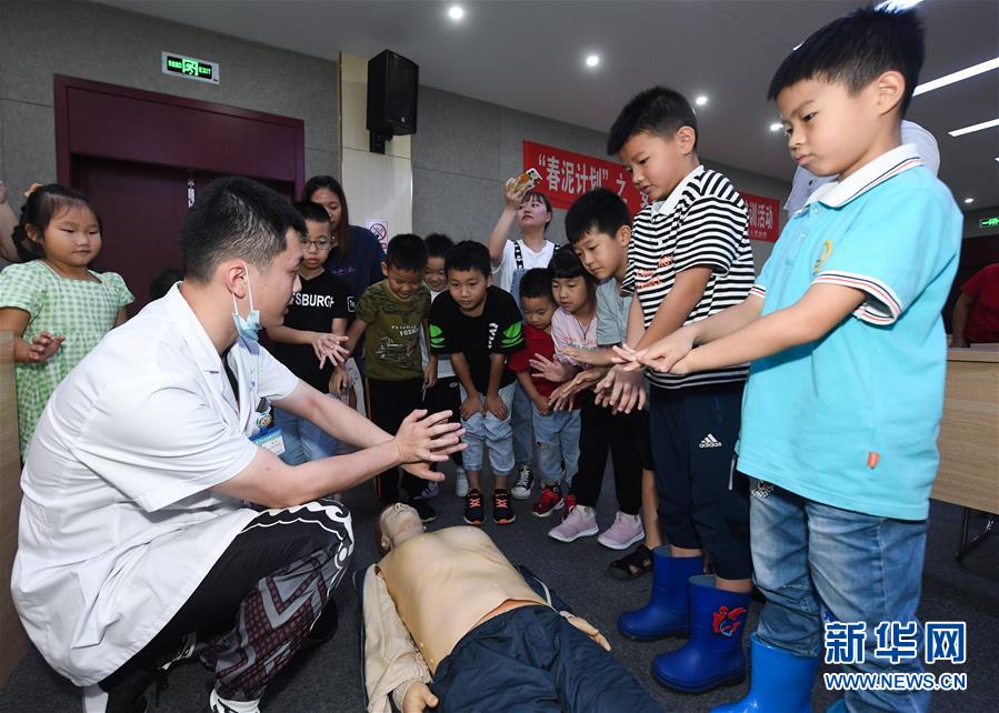 7月16日,東林鎮(zhèn)衛(wèi)生院的醫(yī)護人員(左一)在給學生們示范和講解心肺復蘇的操作知識。當日,浙江省湖州市吳興區(qū)東林鎮(zhèn)舉辦暑期“安全防護小超人”主題活動?;顒佑舍t(yī)護人員、消防隊員等為學生及家長講授日常安全避險及溺水急救知識,中小學們還在現(xiàn)場學習了簡易包扎、心肺復蘇的正確方式,并了解滅火器、滅火毯等消防器材的使用,為學生平安過暑期打好安全防護“預防針”。新華社記者 徐昱 攝