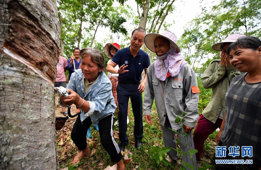 7月15日,中國熱帶農(nóng)業(yè)科學(xué)院橡膠研究所曹建華研究員向瓊中縣什運鄉(xiāng)便文村貧困戶介紹電動割膠刀使用方法。當日,海南瓊中黎族苗族自治縣什運鄉(xiāng)為542名貧困戶免費發(fā)放電動割膠刀,割膠刀研發(fā)單位為貧困戶提供使用技能培訓(xùn)。海南有著豐富的天然橡膠資源,但傳統(tǒng)膠刀的割膠技術(shù)要求高,農(nóng)民難以掌握,許多膠林閑置。電動割膠刀使割膠簡單易學(xué),幫助村民提高割膠效率,助力脫貧增收。新華社記者郭程攝