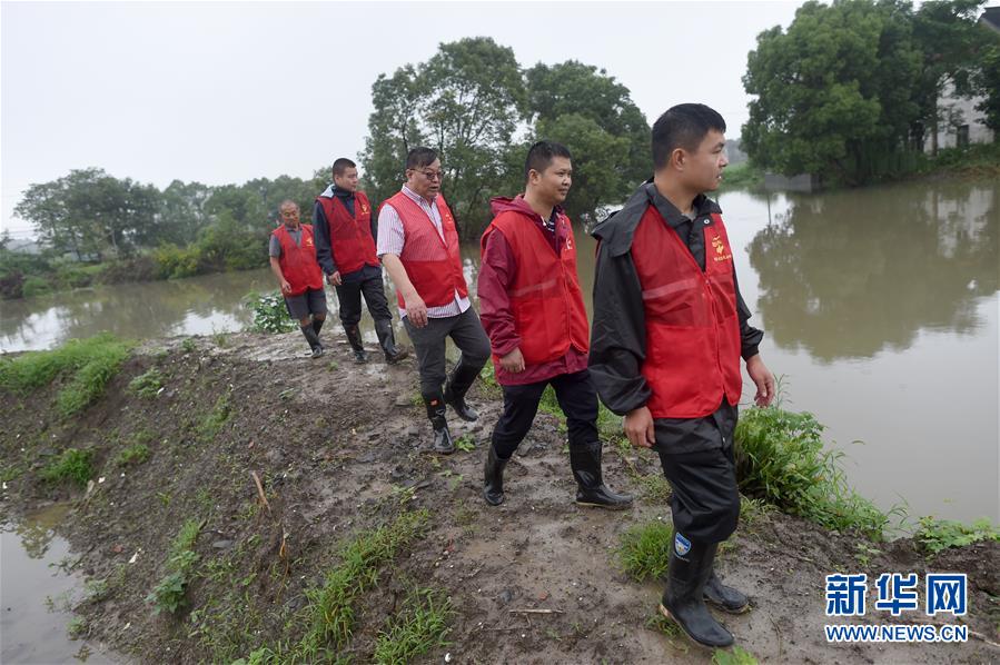 7月17日,基層網格員和志愿者在秀洲區(qū)新塍鎮(zhèn)小金港村的河道邊巡河。浙江省嘉興市秀洲區(qū)處在杭嘉湖平原,受持續(xù)強降雨及上游排水影響,近期,秀洲區(qū)境內的京杭大運河分支航道持續(xù)保持較高水位。當?shù)叵嚓P部門嚴陣以待,落實各項措施,確保安全度汛。新華社記者韓傳號攝