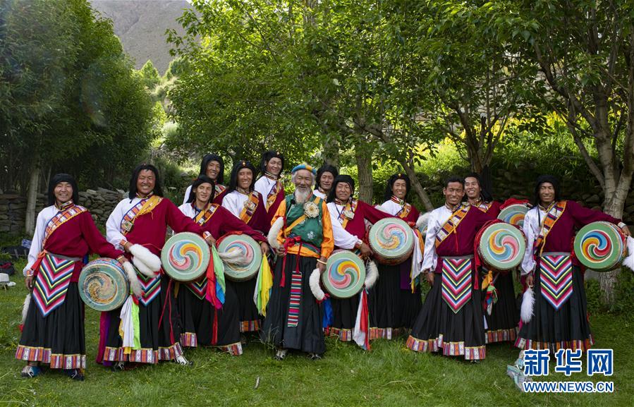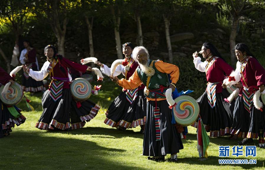 尼瑪老人的弟子們?cè)诒硌荨熬煤幼课琛保?月1日攝)。新華社記者普布扎西攝