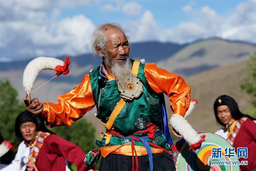 尼瑪老人在表演“久河卓舞”(7月1日攝)。新華社記者詹彥攝