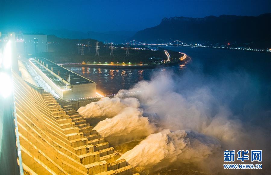 7月19日,三峽樞紐開(kāi)啟泄洪深孔泄洪。19日20時(shí),三峽水庫(kù)入庫(kù)流量4.6萬(wàn)立方米/秒,較本輪洪水的峰值6.1萬(wàn)立方米/秒下降了1.5萬(wàn)立方米/秒?!伴L(zhǎng)江2020年第2號(hào)洪水”平穩(wěn)通過(guò)三峽大壩。新華社記者肖藝九攝