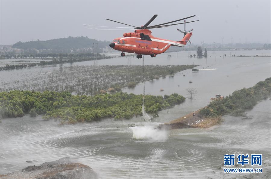 7月16日,湖北省應(yīng)急管理廳緊急調(diào)度直升機,在湖北省陽新縣富河干堤葵賽湖下垸潰口上空,空投網(wǎng)兜石塊。新華社記者程敏攝