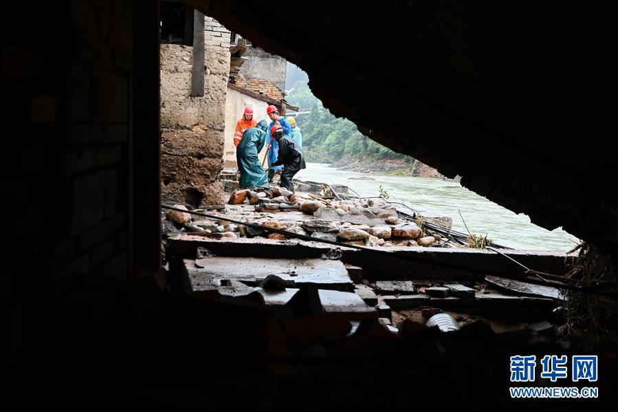 7月10日,救援人員在武夷山市洋莊鄉(xiāng)大安村幫助一戶受災(zāi)村民清理雜物。7月8日以來,福建南平市多個(gè)縣市普降暴雨或大暴雨,造成部分縣市房屋倒塌、農(nóng)田被淹、道路沖毀。新華社記者林善傳攝