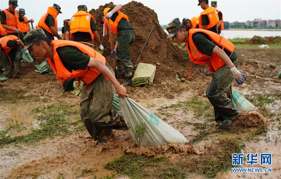 7月11日,武警戰(zhàn)士在江西省鄱陽(yáng)縣鄱陽(yáng)鎮(zhèn)江家?guī)X村搬運(yùn)沙袋。新華社記者周密攝