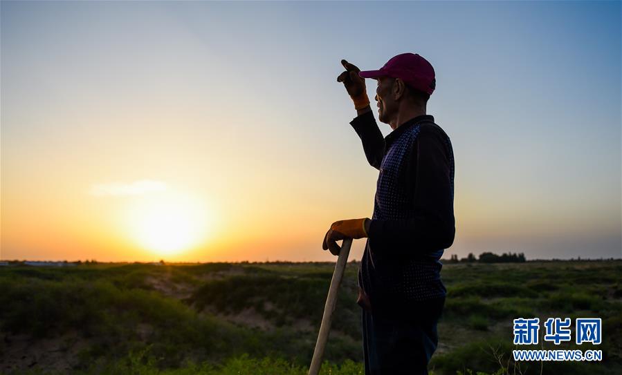 7月7日,孟和巴依爾站在改造后的荒灘上,遠(yuǎn)望騰格里沙漠。1993年,孟和巴依爾看到家鄉(xiāng)內(nèi)蒙古阿拉善盟阿拉善左旗超格圖呼熱蘇木由于過度放牧,草場(chǎng)嚴(yán)重退化,于是,他與家人在家鄉(xiāng)承包了4000多畝草場(chǎng)進(jìn)行治沙造林。27年過去,孟和巴依爾一家承包的草場(chǎng)已從曾經(jīng)生態(tài)脆弱的沙化土地變成了如今的茵茵綠洲。新華社記者連振攝