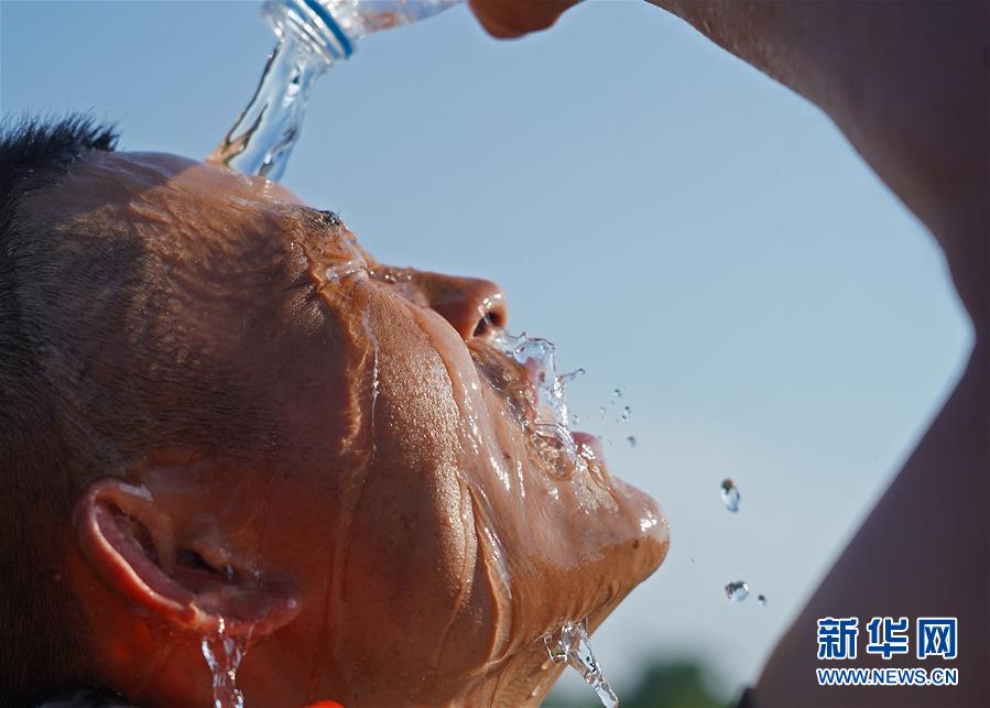 武警江西總隊(duì)上饒支隊(duì)的一名戰(zhàn)士將礦泉水倒在臉上降溫(7月14日攝)。在位于江西省余干縣古埠鎮(zhèn)的齊埠聯(lián)圩上,武警江西總隊(duì)上饒支隊(duì)的60名戰(zhàn)士頭頂烈日,揮汗如雨,在泥水中處置一處堤壩坍塌險(xiǎn)情。新華社記者萬象攝