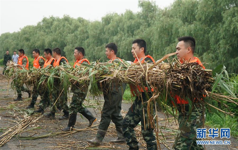 在鎮(zhèn)江市丹徒區(qū)世業(yè)鎮(zhèn)先鋒村西南大堤,中國安能集團第二工程局常州分公司防汛前置備勤隊員準備將捆好的蘆葦放在江堤邊(7月17日攝)。捆蘆葦護邊坡、機器人進涵洞、“養(yǎng)水盆”防滲漏……在江蘇鎮(zhèn)江,當?shù)馗刹咳罕姾蛯I(yè)力量,因地制宜就地取材,老辦法搭配新技術(shù),一批險情得以消除在萌芽狀態(tài)。新華社記者季春鵬攝