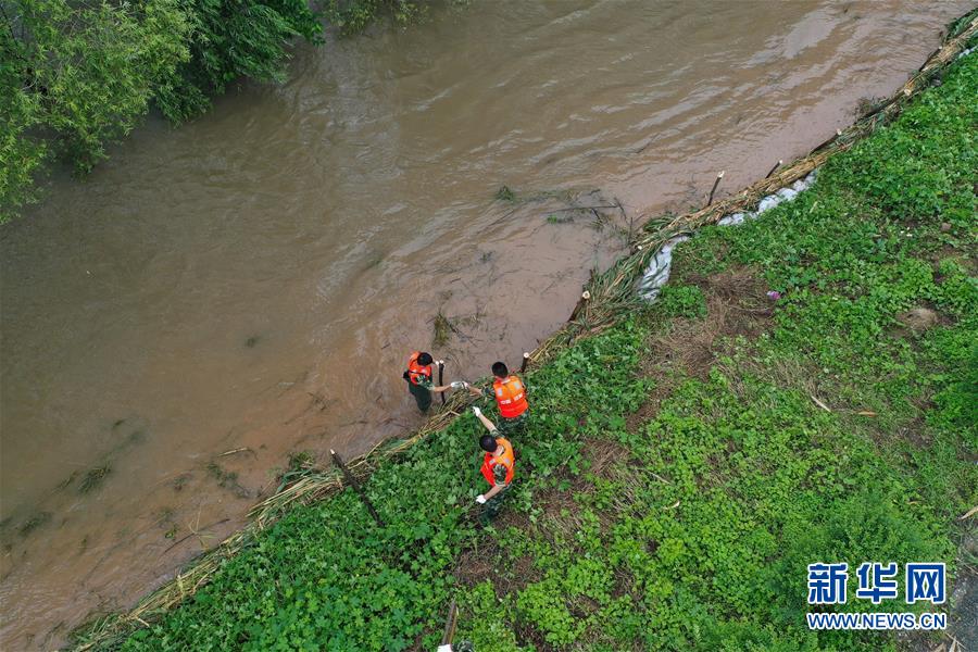 在鎮(zhèn)江市丹徒區(qū)世業(yè)鎮(zhèn)先鋒村西南大堤,中國(guó)安能集團(tuán)第二工程局常州分公司防汛前置備勤隊(duì)員在用木樁固定捆好的蘆葦(7月17日攝,無(wú)人機(jī)照片)。捆蘆葦護(hù)邊坡、機(jī)器人進(jìn)涵洞、“養(yǎng)水盆”防滲漏……在江蘇鎮(zhèn)江,當(dāng)?shù)馗刹咳罕姾蛯I(yè)力量,因地制宜就地取材,老辦法搭配新技術(shù),一批險(xiǎn)情得以消除在萌芽狀態(tài)。新華社記者季春鵬攝