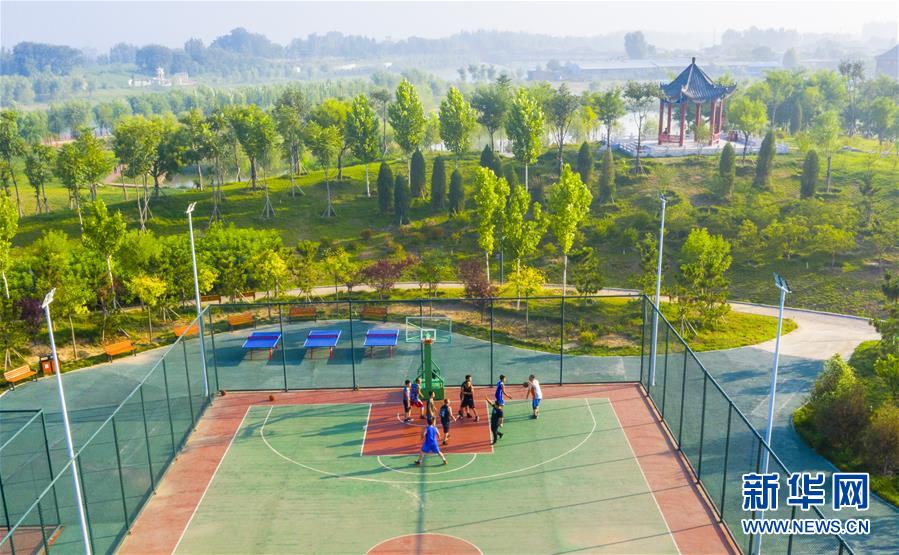 7月20日,市民在河北省武邑縣觀津公園內(nèi)健身(無人機照片)。新華社記者李曉果攝