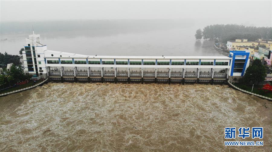 7月20日,洪水通過王家壩閘涌入蒙洼蓄洪區(qū)(無人機照片)。當日8時32分,淮河干流王家壩閘開閘泄洪。受近期強降雨影響,淮河干流王家壩站水位19日快速上漲,7月20日6時36分水位漲至29.66米,超過保證水位0.36米?;春油跫覊伍l開閘泄洪,蒙洼蓄洪區(qū)啟用。新華社記者黃博涵攝