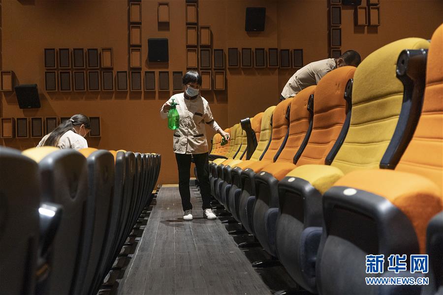7月20日,一家影院的工作人員在觀眾散場后進行消殺工作。當日,在各項疫情防控措施有效落實到位的前提下,武漢市部分電影院恢復開放。新華社記者熊琦攝