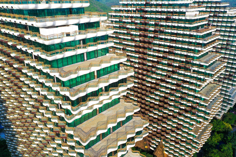 2020年7月20日,海南省三亞市,圖為航拍的“九棵大樹”建筑群,其具象性的建筑設(shè)計風(fēng)格,既有建筑之美,又見自然靈韻。