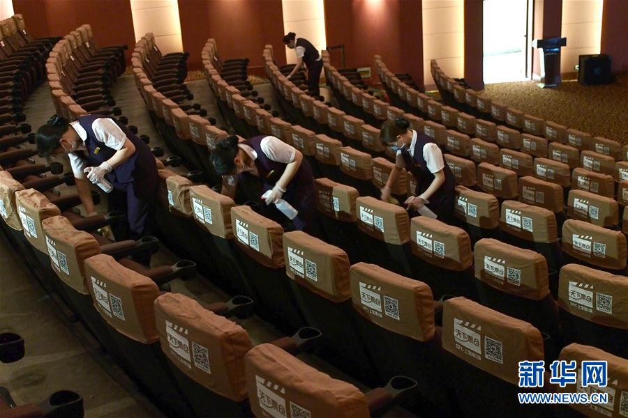 2020年7月19日,上海影城員工在放映廳里為座位消毒。當(dāng)日,上海部分電影院為恢復(fù)開放營業(yè)進(jìn)行最后階段準(zhǔn)備。新華社記者任瓏攝