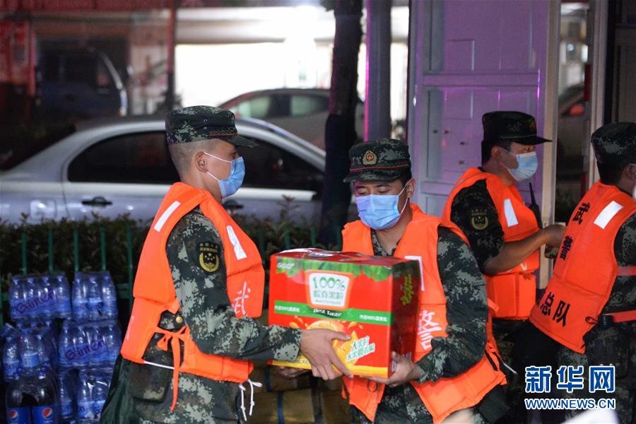 7月20日凌晨,在位于蒙洼蓄洪區(qū)內(nèi)的老觀鄉(xiāng)老觀村,武警安徽總隊(duì)阜陽支隊(duì)的官兵幫助一家超市轉(zhuǎn)移貨物。新華社記者黃博涵攝