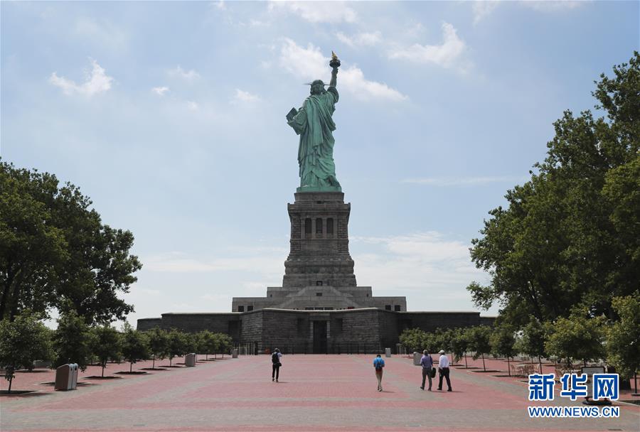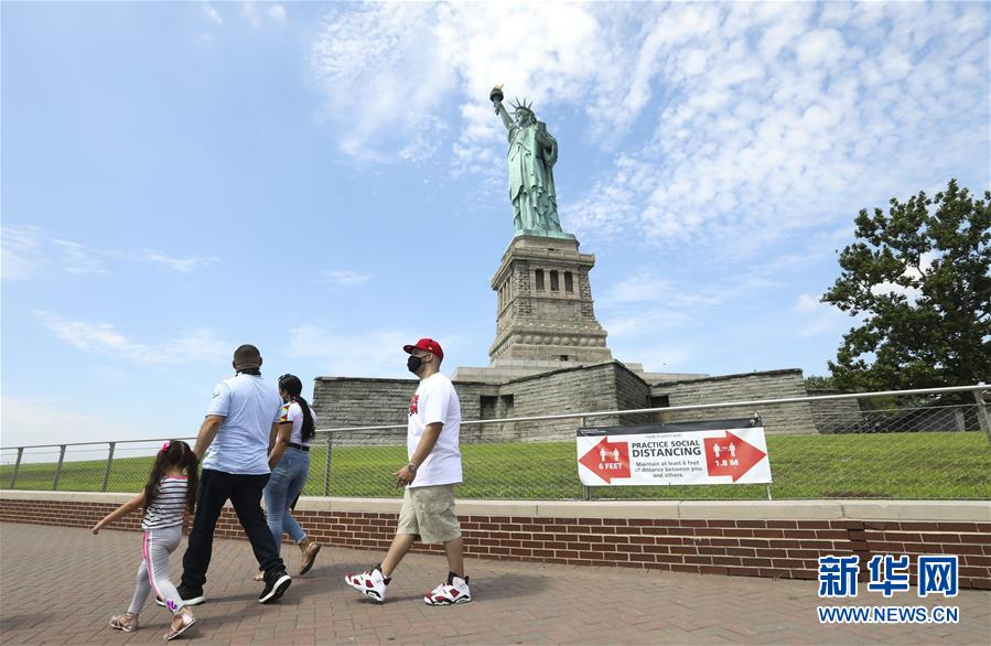 7月20日,參觀者在美國紐約自由島游覽。美國紐約市20日繼續(xù)推進(jìn)經(jīng)濟(jì)重啟計(jì)劃,宣布開始進(jìn)入解封新階段,進(jìn)一步允許部分低風(fēng)險(xiǎn)文娛活動重啟。自由女神像所在的自由島對公眾開放,但雕像內(nèi)部和博物館仍關(guān)閉。新華社記者王迎攝