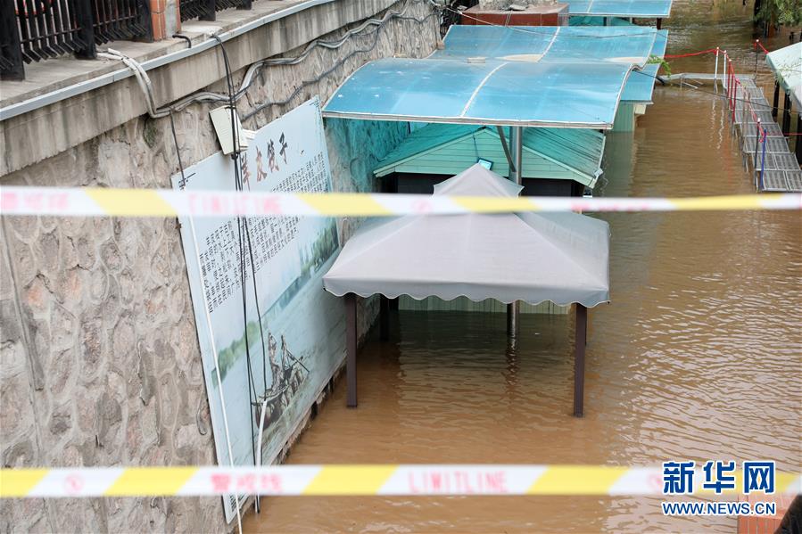 在蘭州市城關(guān)區(qū)黃河蘭州段南岸,被淹的羊皮筏子售票處門口拉上了警戒線(7月21日攝)。據(jù)了解,受降雨影響,黃河蘭州以上來水持續(xù)增加,黃河蘭州水文站7月20日20時42分流量達到3000立方米每秒,出現(xiàn)黃河2020年第2號洪水。新華社記者馬莎攝