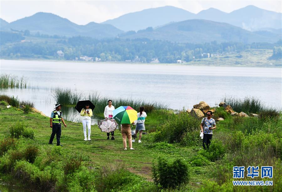 草海巡護員(左一)在勸導游客不要擅自進入草海保護區(qū)內游覽(6月10日攝)。新華社記者楊文斌攝