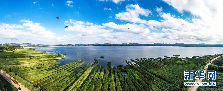 鳥(niǎo)兒在草海上空飛翔(無(wú)人機(jī)全景照片,6月9日攝)。新華社記者楊文斌攝