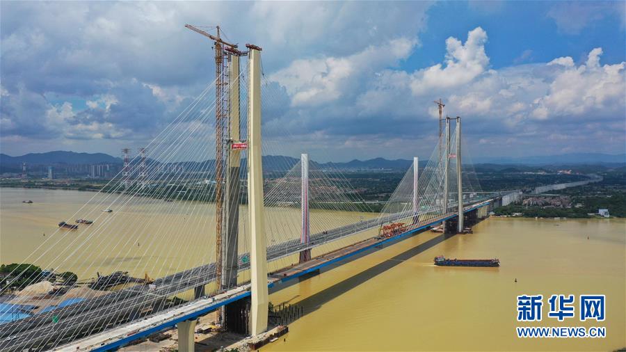 7月22日拍攝的廣州南沙港鐵路跨西江特大斜拉橋最后一組斜拉索吊裝現(xiàn)場(chǎng)(無(wú)人機(jī)照片)。新華社記者劉大偉攝